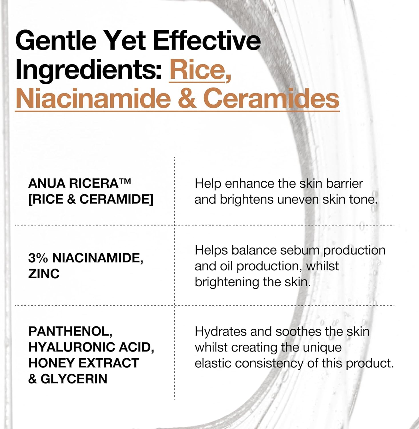 DAILY BRIGHTENING SERUM FOR ALL SKIN TYPES : Formulated with ANUA RICERA 7+ and Arbutin, this serum nourishes and hydrates the skin whilst brightening dull skin to achieve even skin tone. UNIQUE ELASTIC CONSISTENCY : A blend of Honey Extract, Rice Extract and Hyaluronic Acid creates a unique elastic yet lightweight texture of this serum. CONTORLS SEBUM AND OIL : With 3% Niacinamide and Zinc, this serum controls oiliness and excess sebum making it suitable for oily skin to prevent blemishes. SKIN BARRIER REPAIR : With ceramides and panthenol, this serum repairs damaged skin barrier and protects the skin barrier all at once. SOOTHES & HYDRATES : Contains Hyaluronic Acid and Glycerin to provide instant hydration to achieve glass skin. It’s fragrance free with gentle ingredients, making it suitable for all skin types to use everyday, AM & PM.