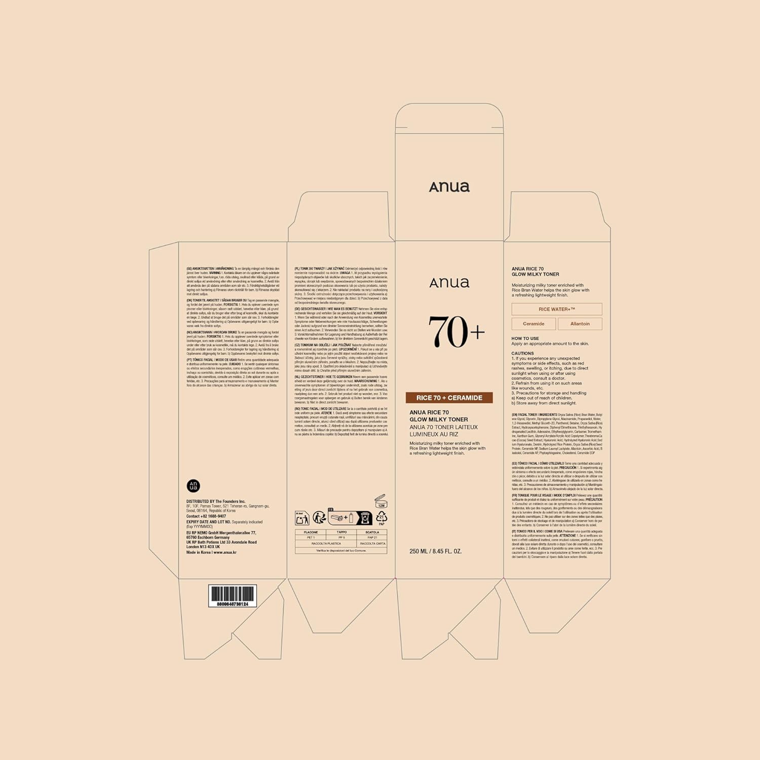 • [70% ANUA Rice Water+] Enriched with rice water, niacinamide and ceramides - provides intensive moisture, refines the complexion and provides a fresh, even finish without stickiness.