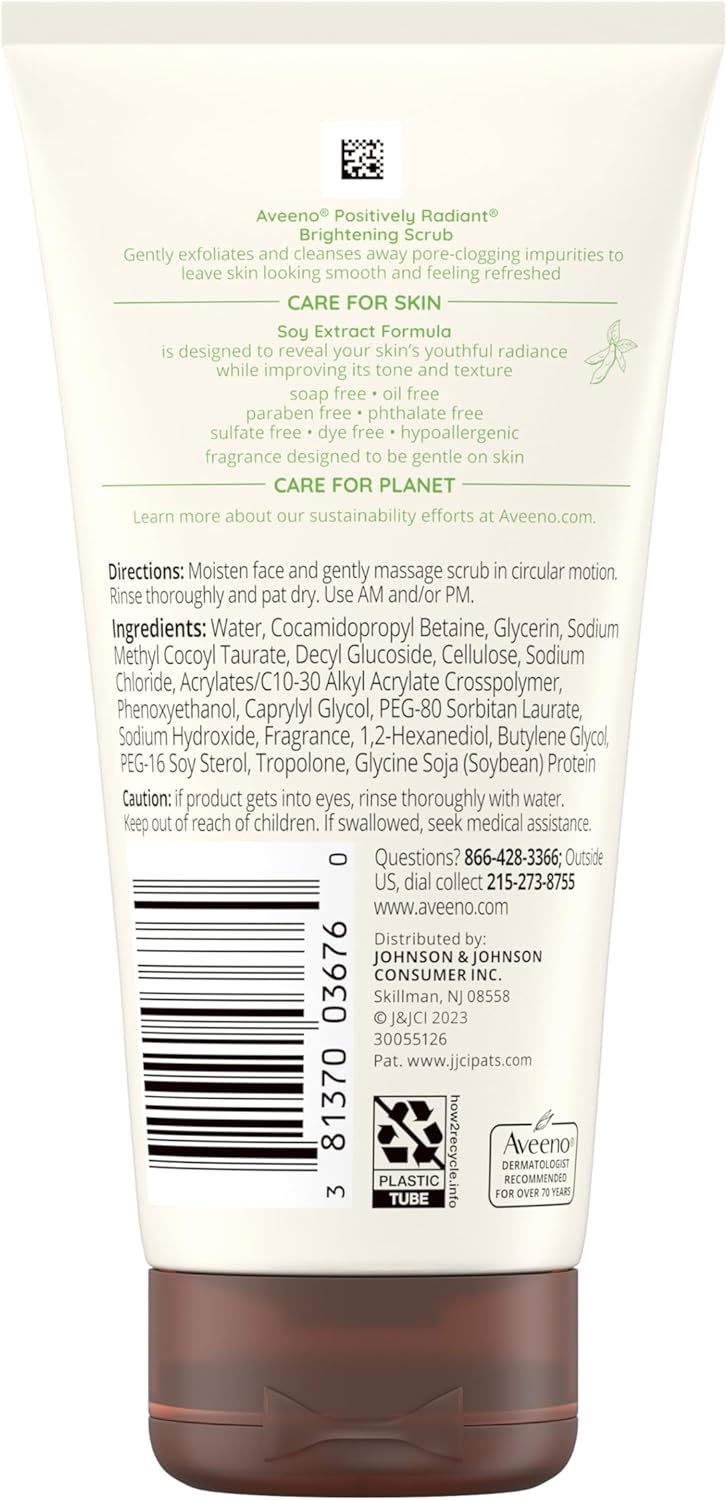 5-ounce tube of Aveeno Positively Radiant Skin Brightening & Exfoliating Daily Face Scrub cleanses & buffs away dead skin, surface impurities, & oil for softer, brighter skin. This scrub helps improve skin's tone & texture & reveals radiant-looking skin