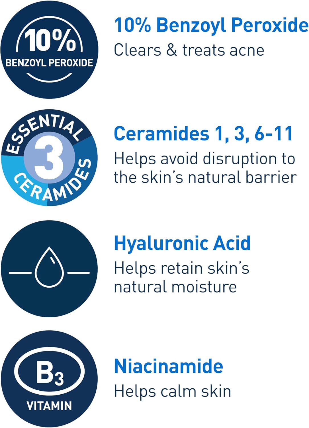Developed with dermatologists, this lightly foaming, creamy face and body wash is formulated with maximum OTC strength 10% benzoyl peroxide to help clear face and body acne while leaving the skin soft and comfortable. This gentle, yet effective wash contains the highest concentration of benzoyl peroxide available without a prescription to treat acne without disrupting skin’s protective barrier. The formula feels gentle on skin, and skin is left feeling comfortable, smooth and looking clarified. • Non-comedogenic • Paraben-free • Fragrance-free • Suitable for acne prone skin Key Ingredients: • 10% Benzoyl Peroxide: Maximum OTC strength 10% Benzoyl Peroxide clears acne pimples and blackheads and helps prevent new acne from forming. • Ceramides: Essential for healthy skin, ceramides are critical components of the skin’s natural moisture barrier • Hyaluronic Acid: This ingredient attracts hydration to the skin’s surface and helps the skin retain moisture • Niacinamide: Known to help calm the skin How to Use: • Apply a dime-size amount to damp skin and gently massage, avoiding the eye area • Rinse well • Use acne face wash on entire affected area one to two times daily • Because excessive drying of the skin may occur, start with one application daily, then gradually increase to two times daily if needed or as directed by a doctor • If bothersome dryness or peeling occurs, reduce application to once a day or every other day • If going outside, apply sunscreen after using this product. If irritation or sensitivity develops, stop use of both products or ask a doctor.