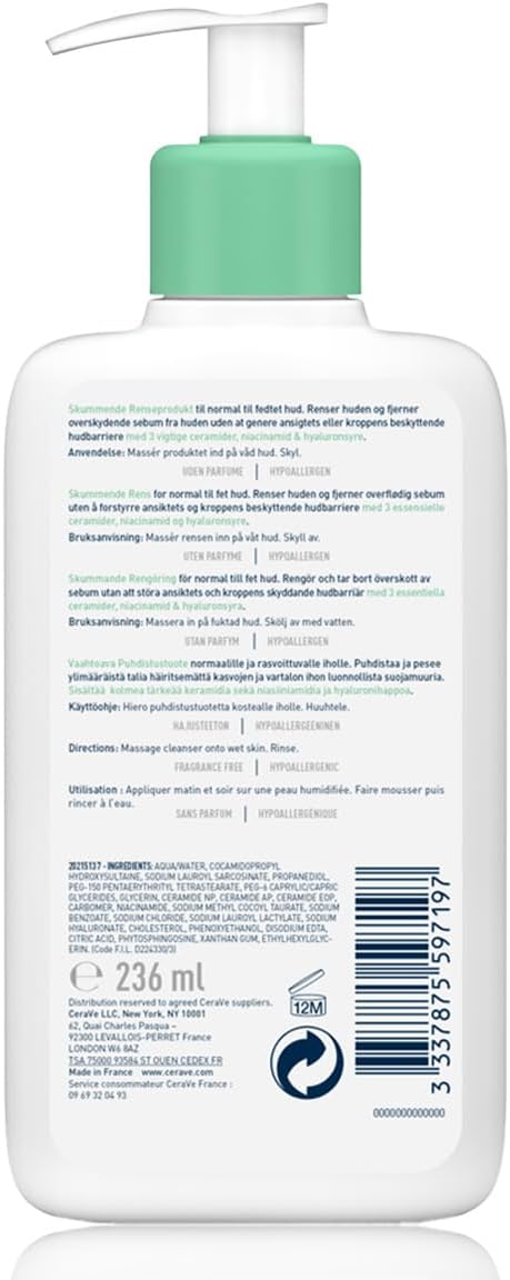 Cerave Foaming Cleanser for Normal to Oily Skin with Hyaluronic Acid