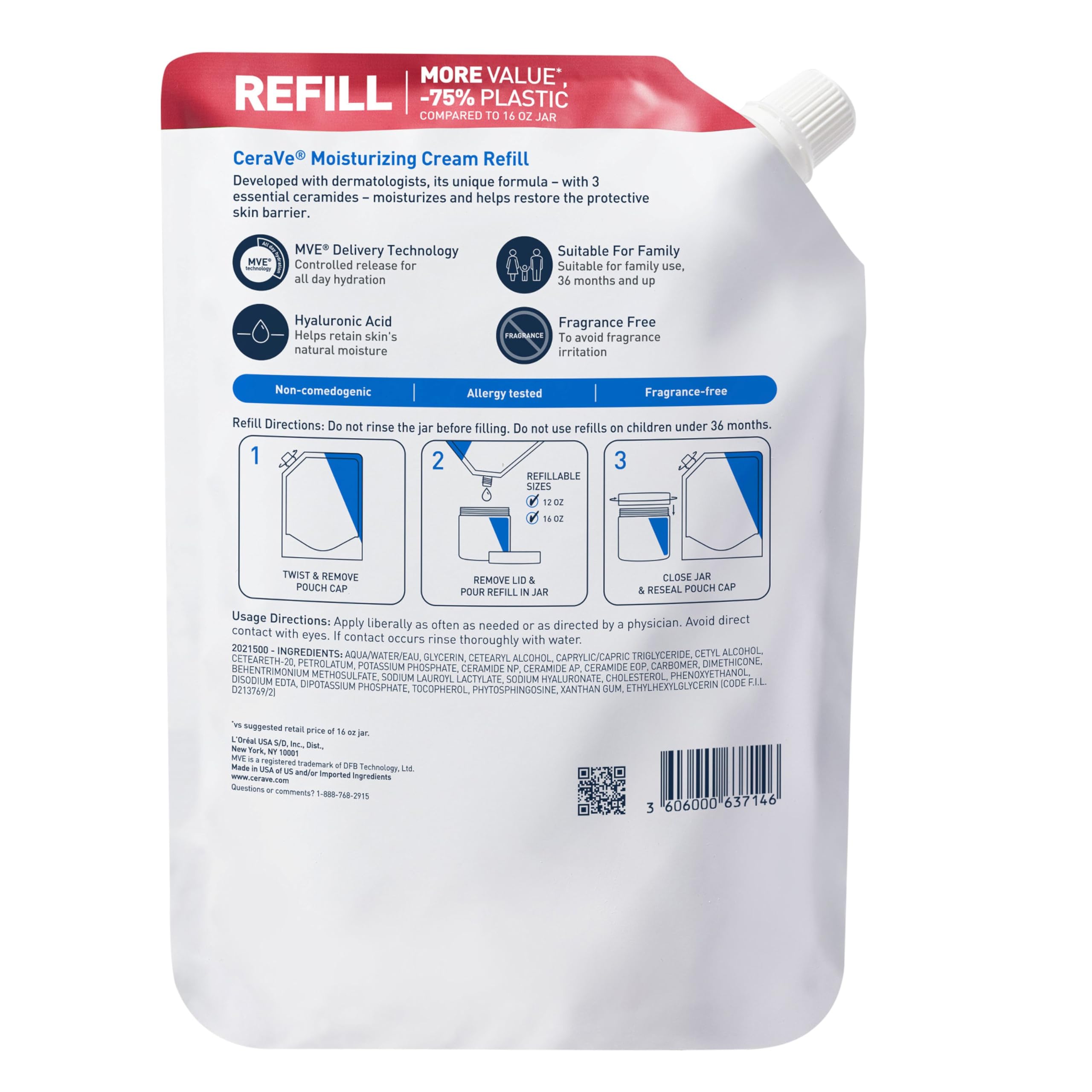 Developed with dermatologists, CeraVe Moisturizing Cream has a unique formula that provides 24-hour hydration and helps restore the protective skin barrier with three essential ceramides (1,3,6-II) and hyaluronic acid. This rich, non-greasy, fast-absorbing formula is ideal for sensitive skin on both the face and body Featuring our patented MVE Technology to release a steady stream of moisturizing ingredients throughout the day and night.