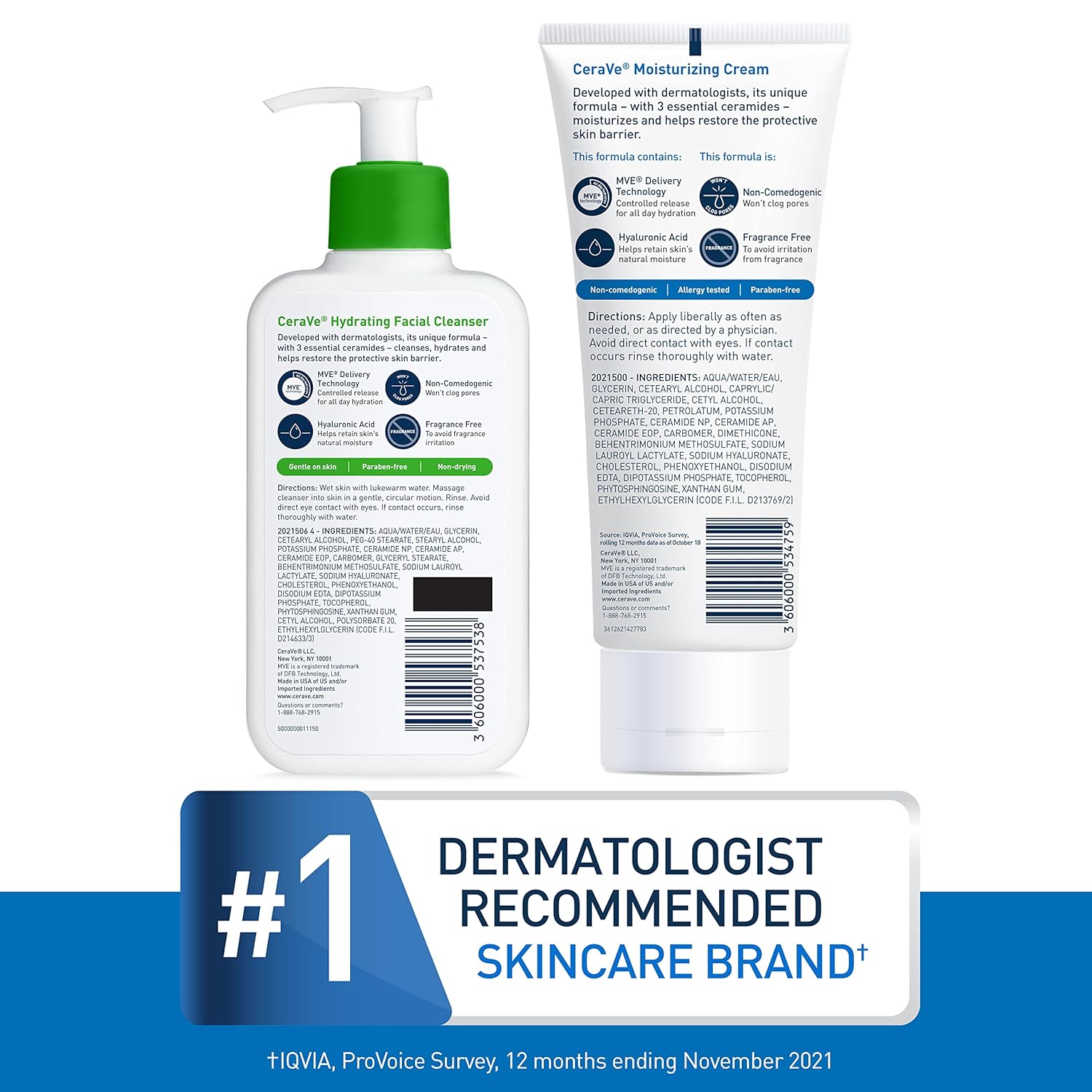 [ MOISTURIZING CREAM & HYDRATING FACE WASH BUNDLE ] Contains 16oz CeraVe Moisturizing Cream with convenient pump top. Combo pack includes a sample size of CeraVe Hydrating Facial Cleanser