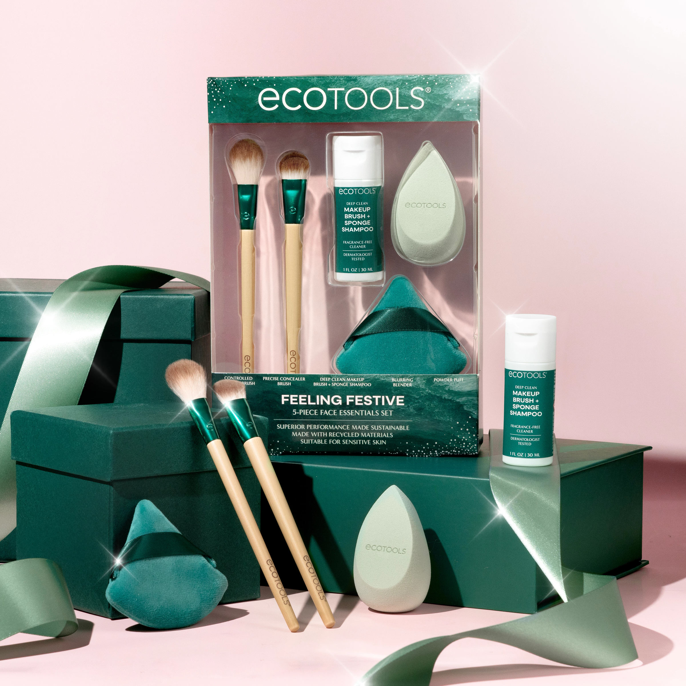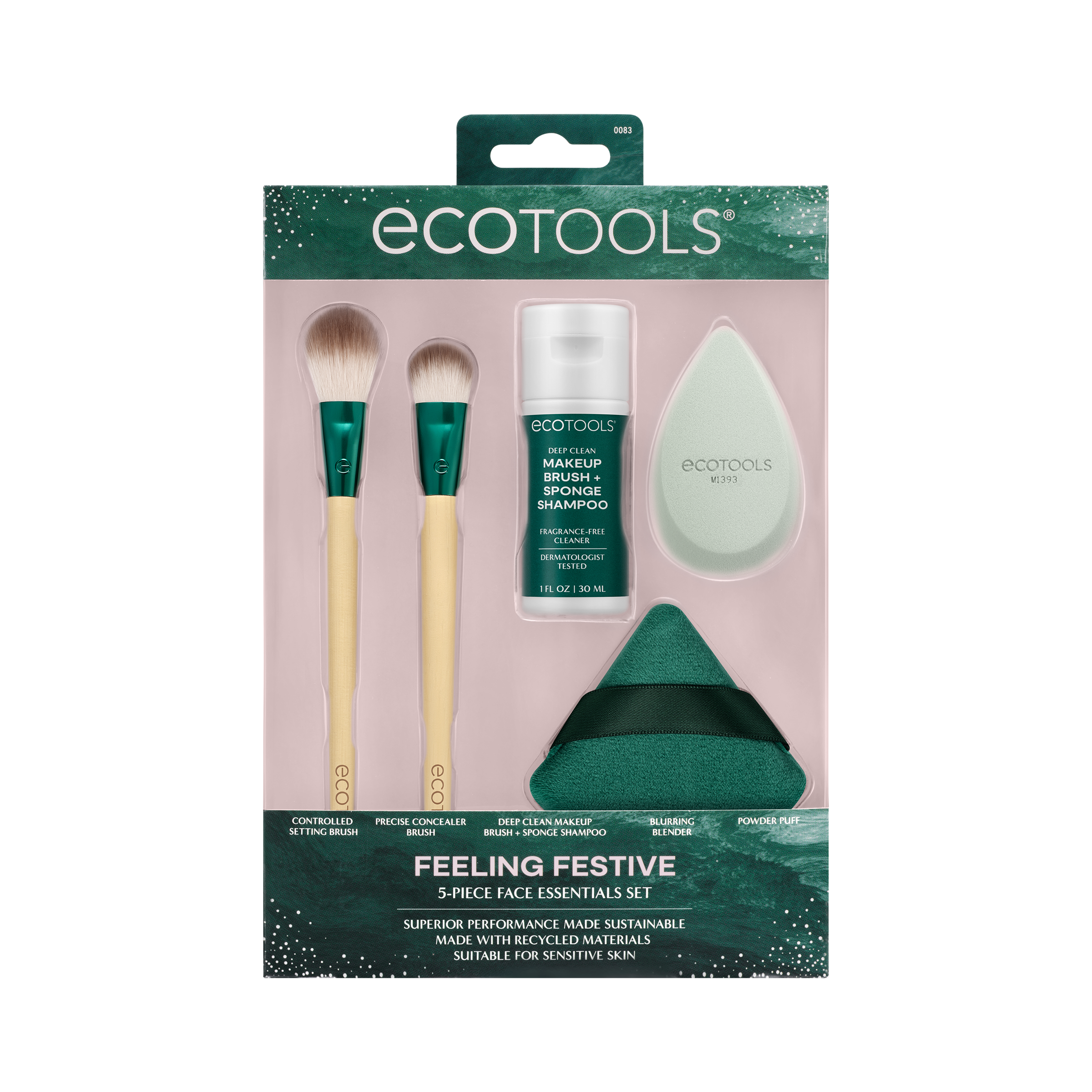 The EcoTools Feeling Festive Essentials Set is a limited-edition gift set that brings you 5 makeup tools that work together to provide a flawless, blended, and set base,Includes: (1) Controlled Setting Brush, (1) Precise Concealer Brush, (1) Deep Clean Makeup Brush + Sponge Shampoo, (1) Blurring Blender, and (1) Powder Puff,Concealer brush and makeup sponge work best with liquid and cream foundation and concealer,Controlled Setting Brush and Powder Puff are best used with powder products such as setting powder,Triangle shaped powder puff provides targeted application and 2-sided Blurring Blender for custom coverage,Makeup blender sponge made with cloud coverage memory foam that absorbs less makeup product,EcoTools makeup brushes feature 100% renewable bamboo handles and aluminum ferrules,Limited-edition EcoTools Collection – Great holiday gift set for any makeup-lover in your life,100% Cruelty-Free, Latex-Free, and Vegan- EcoTools products are never tested on animals,Eco-Friendly, FSC®-certified compostable paper packaging*