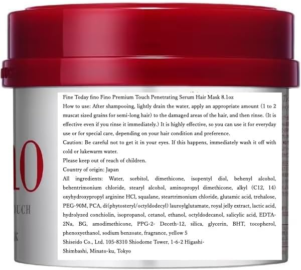 Fino Hair Essence Mask Is A Perfect Hair Pack For Dry, Damaged Hair Because It Contains 7 Different Types Of Beauty Essence, The Rich Ingredients That Can Pervade Into Hair To Restore Moist And Shine! The 7 Beauty Essences Are Royal Jelly Ex, Trehalos And Sorbitol, Pca, Fitosterol, Lipidure Ex, Squalane And Dimetikon, Glutamine. How To Use: Use This Product After Shampoo & Conditioner. 1. Brush Hair Thoroughly And Comb Out All The Tangles. 2. Apply The Hair Treatment To Your Palms. 3. Massage And Coat Your Hair Thoroughly. 4. Put On A Shower Cap, Or Just Use Some Saran Wrap To Cover Hair For 5 Minutes Or So. 5. Rinse Your Hair Thoroughly.