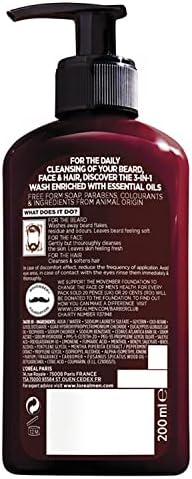 The L'Oreal Paris 3-In-1 Wash Suitable As A Beard Shampoo, Hair Shampoo & As A Face Wash For Your Beard: Washes Away Beard Flakes And Dandruff, Removes Residue, Leaving Your Beard Feeling Soft And Smooth For Your Face: Deeply Cleanses And Gently Purifies Your Skin. For Your Hair: Cleanses And Conditions, Leaving Your Scalp Feeling Comfortable Enriched With Cedarwood Essential Oil. No Soap, Parabens Or Colorants And Made Without Any Ingredients Derived From Animals.