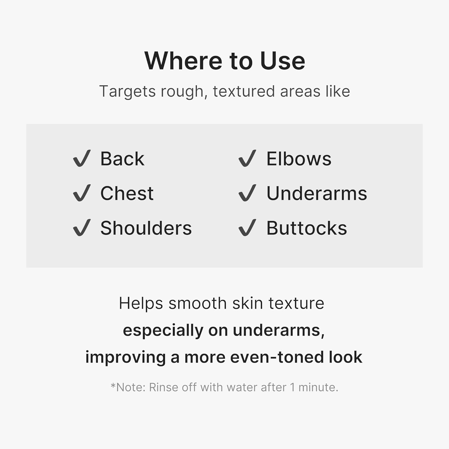 • Exfoliating Wash-off Body Spray: Spray onto your targeted body areas including back, chest, legs and arms, gently massage and rinse with lukewarm water after 1 minute. Helps to smooth out and resurface rough, bumpy body skin.