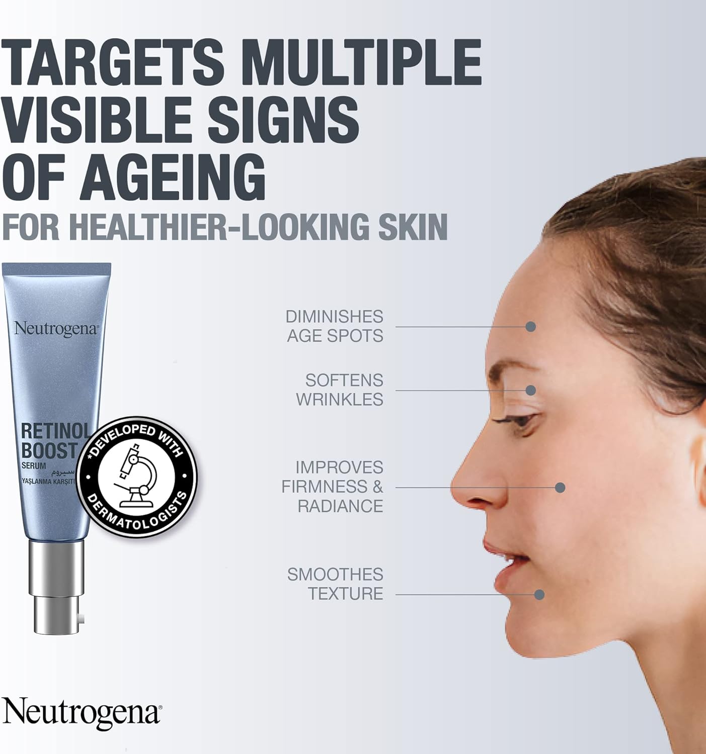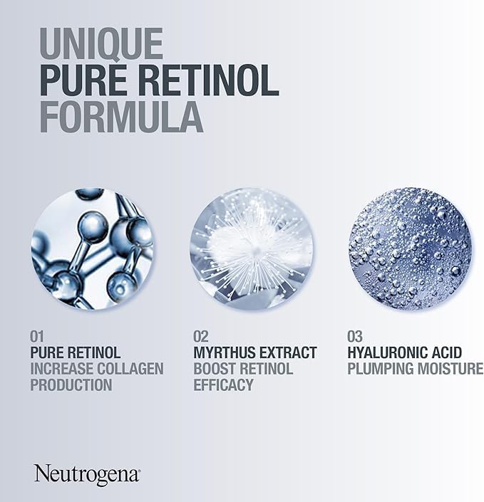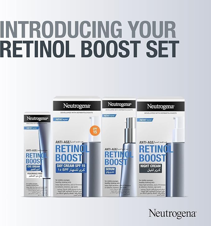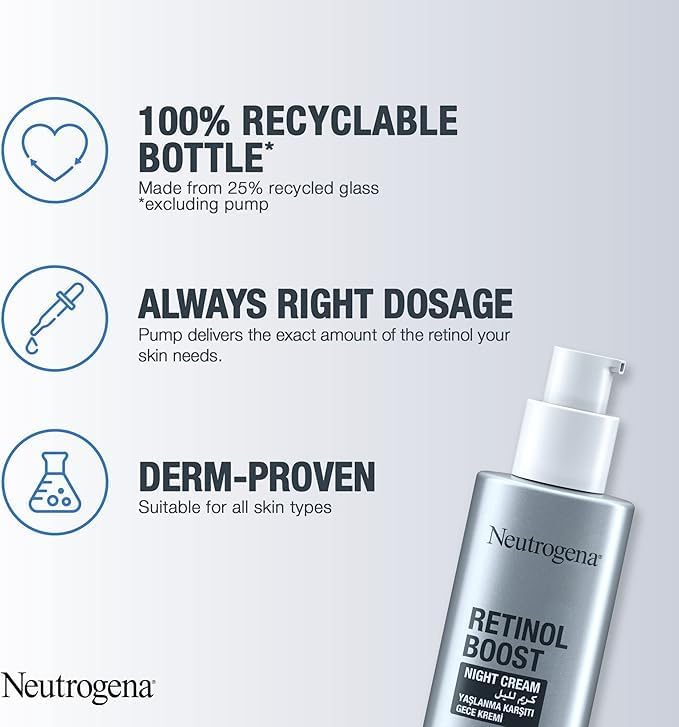 Neutrogena Retinol Boost Night Cream was developed with dermatologists to fight visible signs of ageing. It is made from carefully selected ingredients that work together to reduce the appearance of wrinkles, dryness, and age spots and to improve skin firmness and radiance. This night moisturizer’s lightweight formula is fast absorbing and does not feel greasy and oily on the skin. It effectively delivers Pure Retinol within skin's surface to fight the visible signs of ageing & improve the look of skin. Made from powerful ingredients, this face and neck cream works towards visibly younger and healthier-looking skin in just 1 week*. It is packed with Pure Retinol; a form of Vitamin A scientifically proven to increase collagen production and promote renewal of surface skin cells. Over time, it works to fight fine lines, dullness, wrinkles, and age spots. Our unique formula combines Pure retinol with Myrthus plant extract known for its skin regenerating benefits, and Hyaluronic acid for intense hydration & plumping moisture. CLINICALLY PROVEN RESULTS: IN 1 WEEK*: Improves skin texture. Provides an even skin tone (+29.5%**). IN 4 WEEKS*: Softens wrinkles. Reduces the appearance of fine lines (-37.7%**). IN 8 WEEKS*: Softens pigmentation spots (-48.3%**). * Clinical grading on 39 women over 8 weeks, once a day usage. **Average % improvement.