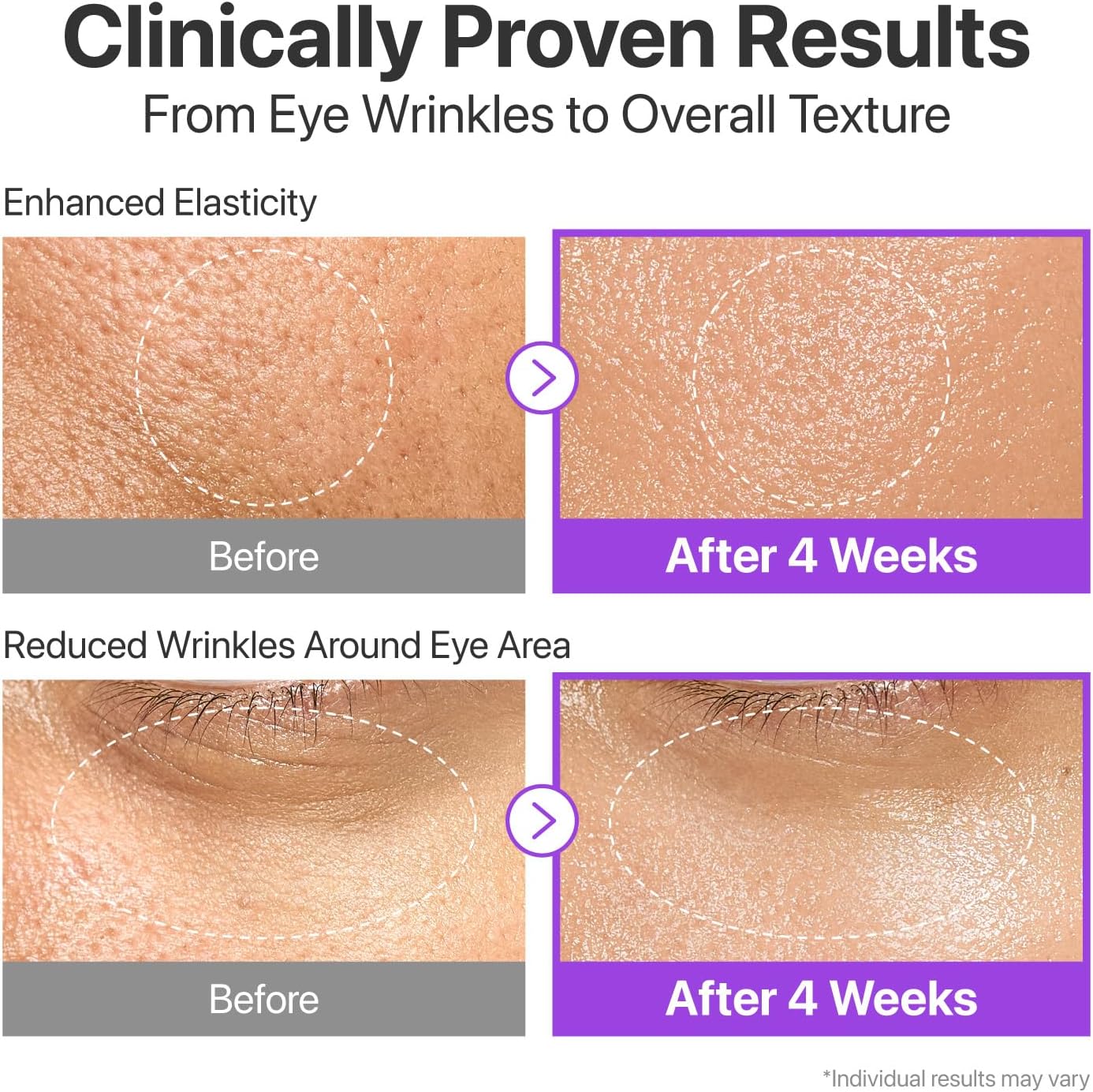 [CLINICALLY TESTED] Clinically proven to reduce 11 types of wrinkles (forehead lines, frown lines, crow’s feet, tear troughs, bunny lines, lip lines, smile lines, marionette lines, mouth frown, chin wrinkles, and neck lines) in just 4 weeks.