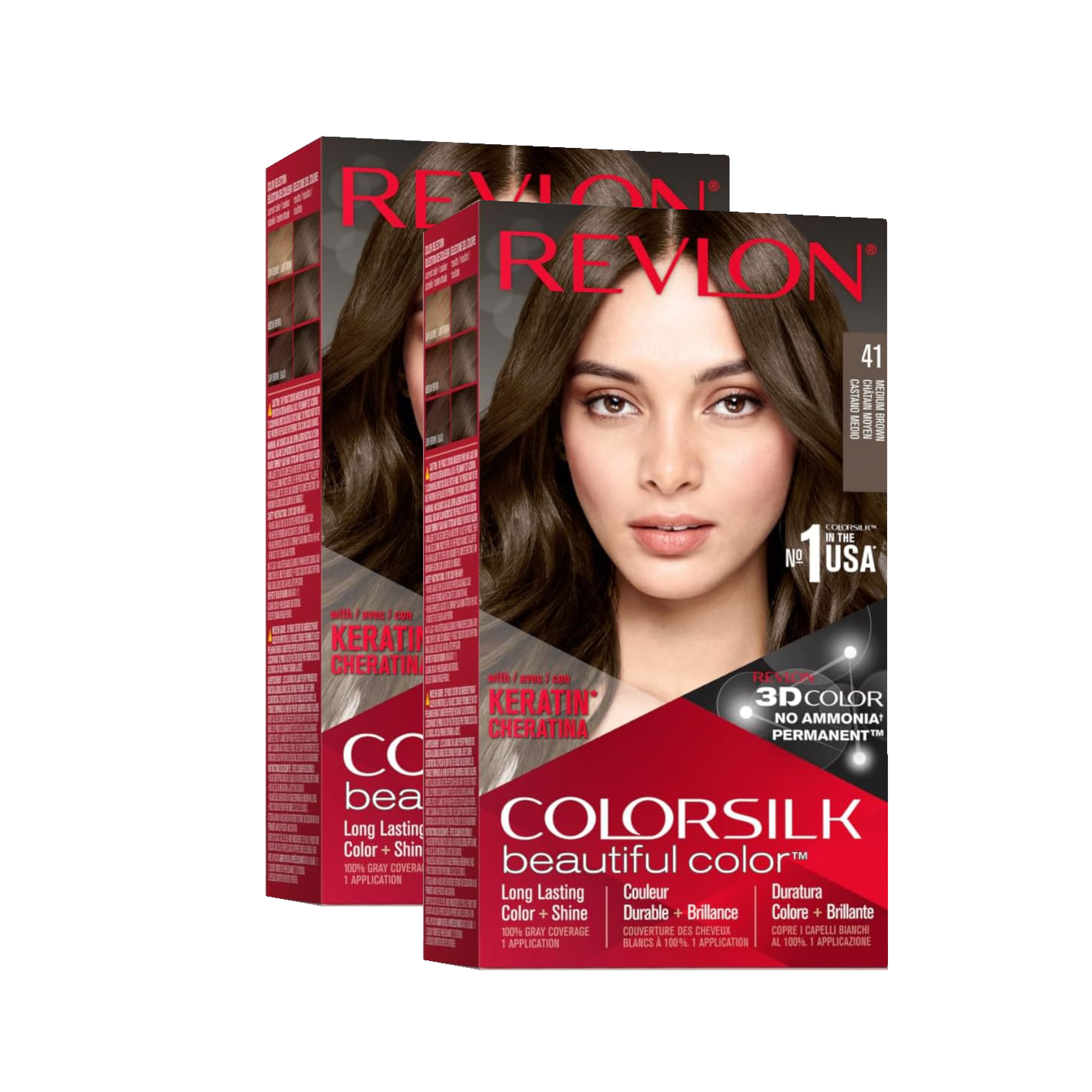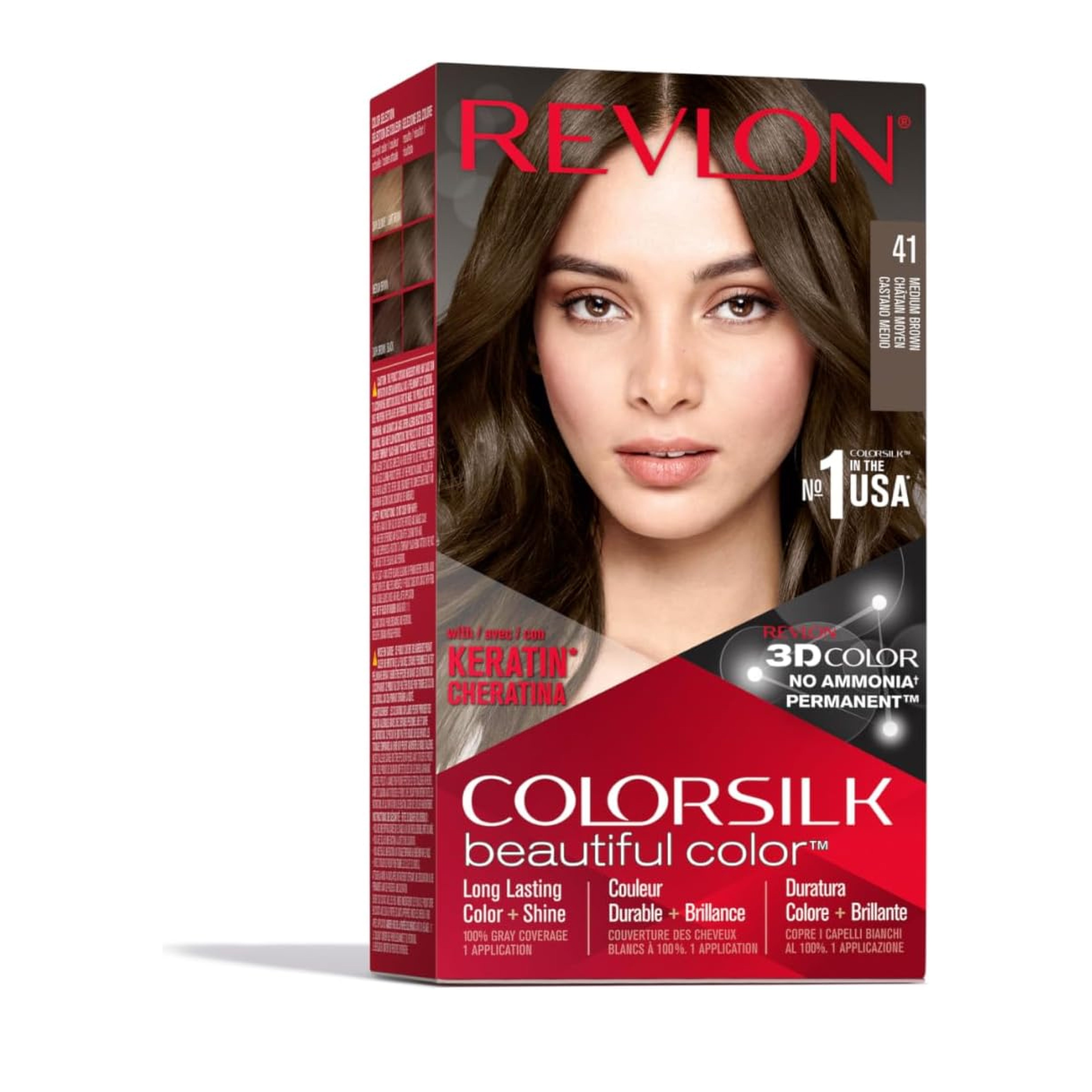 Revlon Colorsilk 3D Permanent Hair Colour in Medium Brown (Shade 041) provides rich, natural-looking color with multi-dimensional shine. The ammonia-free formula delivers 100% gray coverage while keeping hair soft and silky. With its non-drip, easy-to-apply formula, it ensures even results from root to tip for healthy-looking, radiant hair.