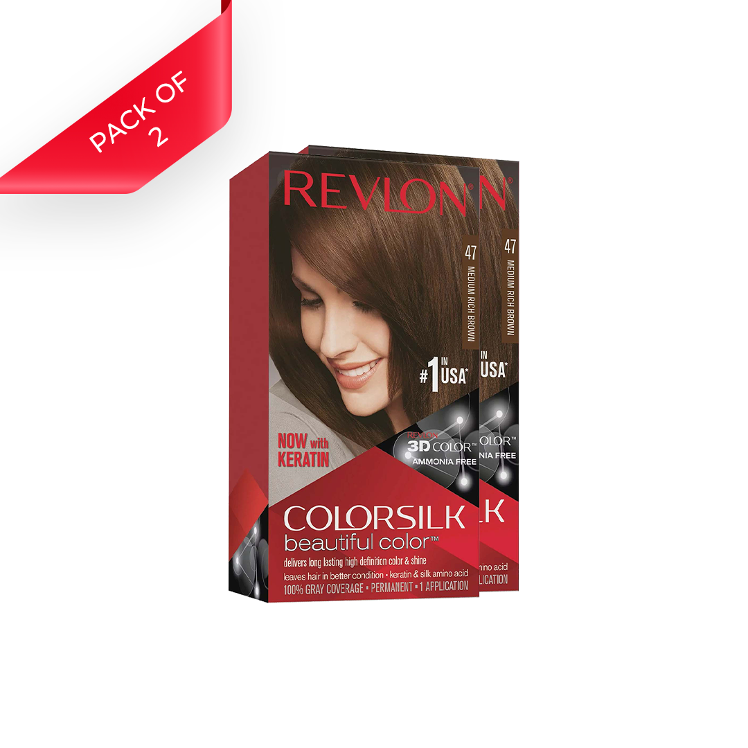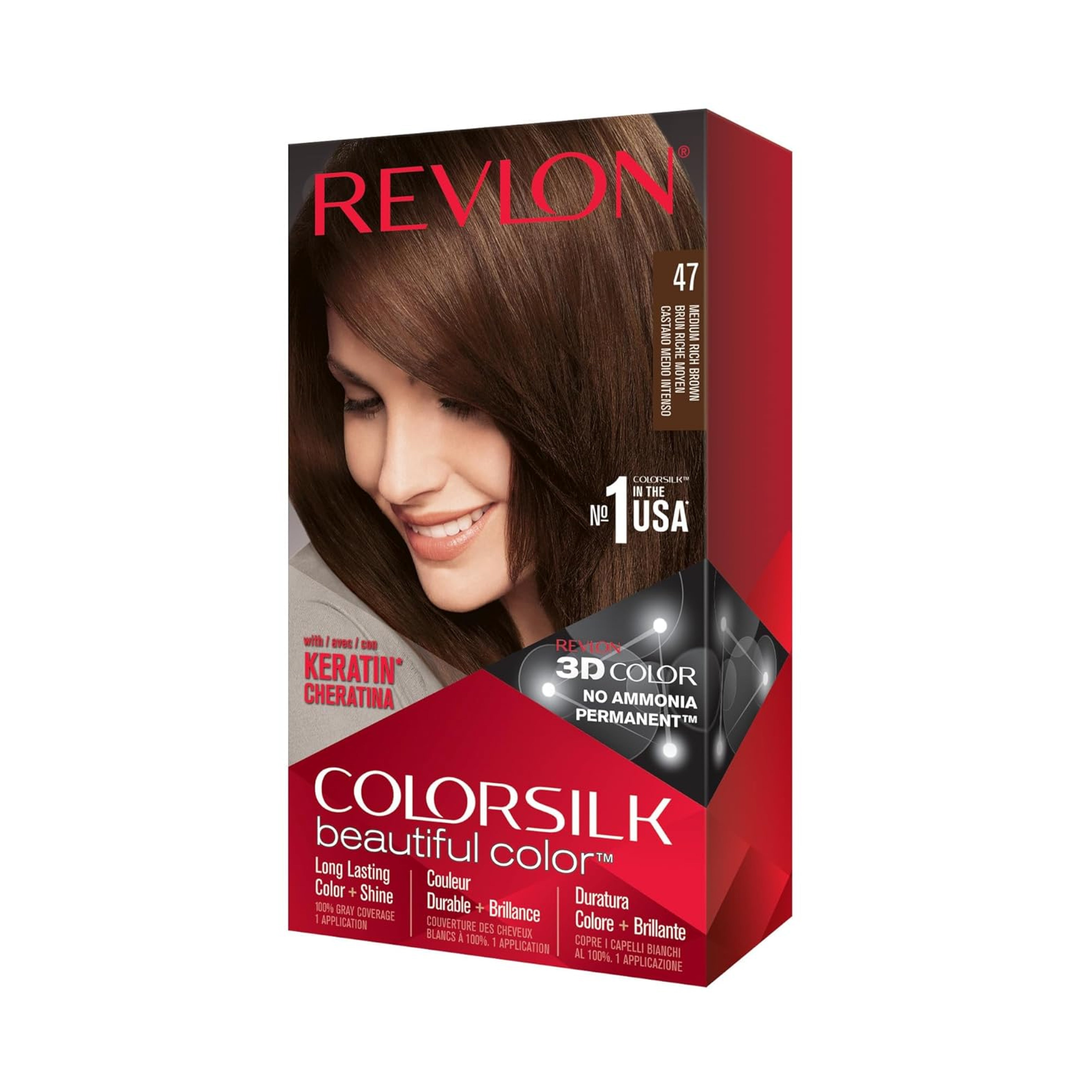 Revlon Colorsilk Beautiful Color in Medium Rich Brown (Shade 47) delivers natural-looking, multi-dimensional color with shine. This permanent, ammonia-free hair dye provides 100% gray coverage while leaving hair soft, silky, and radiant. Enriched with silk proteins and UV defense, the formula conditions hair during the coloring process for a smooth and vibrant finish.