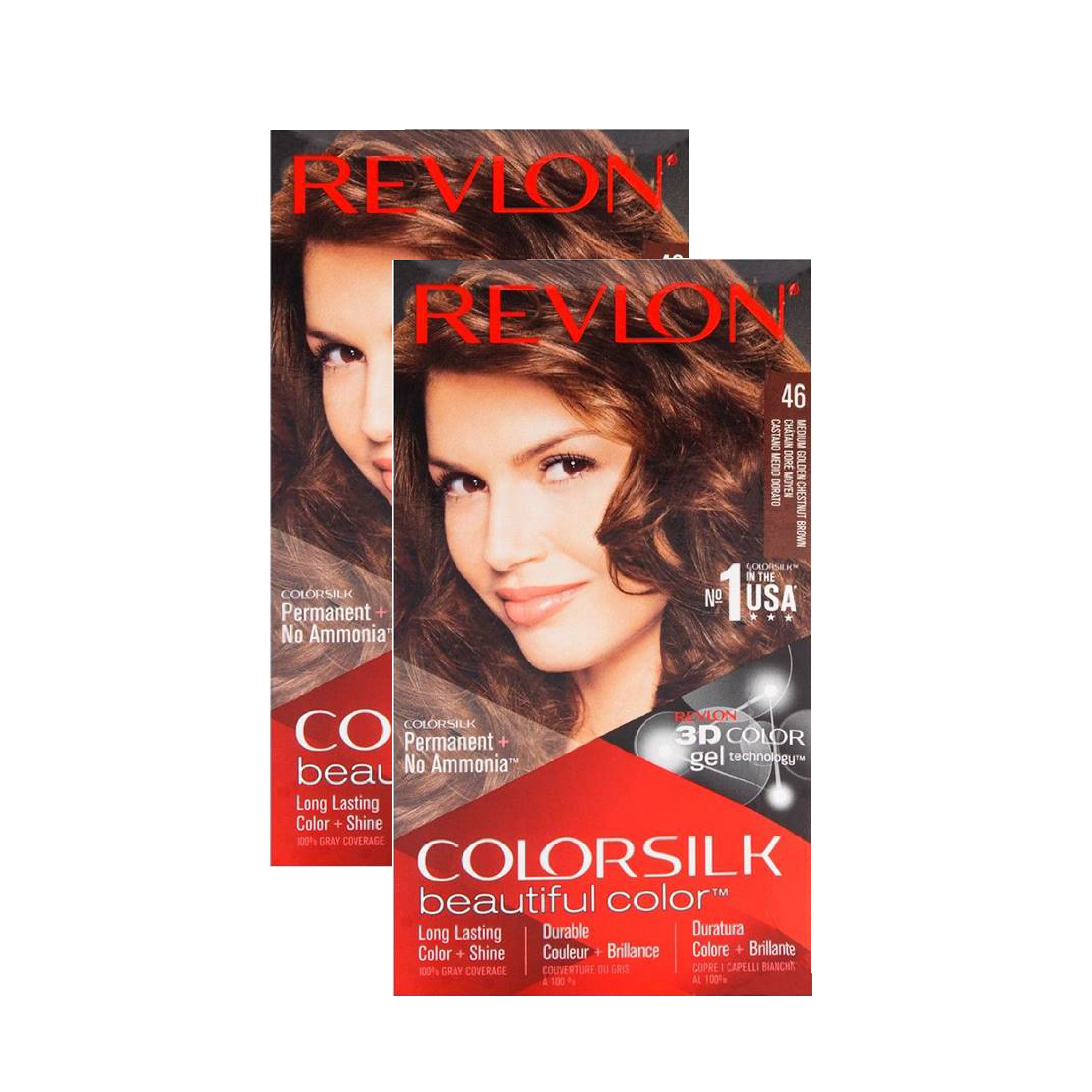 Revlon ColorSilk in 46 Medium Golden Chestnut Brown delivers a rich, golden-brown shade with natural-looking dimension. Formulated with Revlon’s 3D Color Gel Technology™, it provides 100% gray coverage and multi-tonal color that looks vibrant and long-lasting.