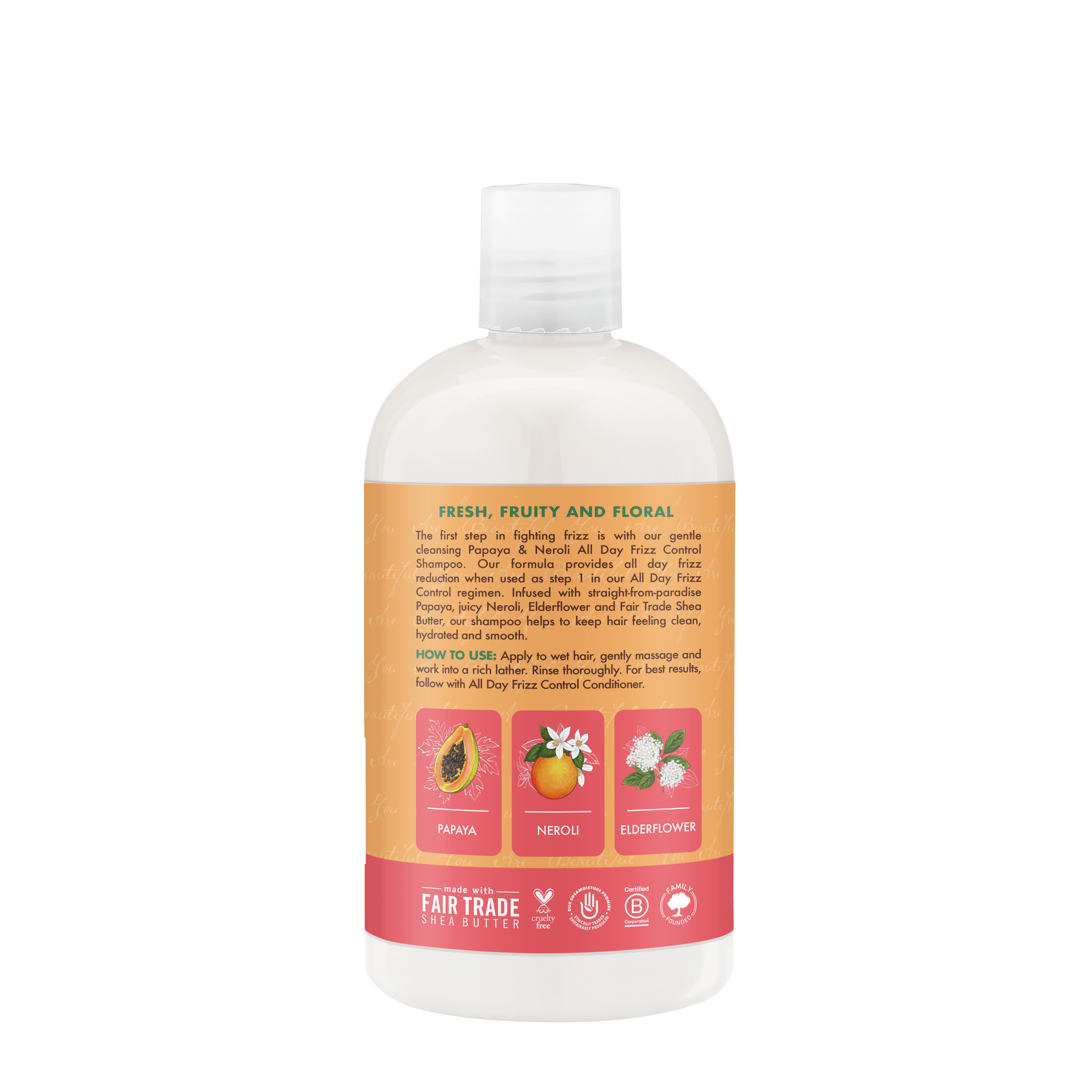 The first step in fighting frizz is with our gentle cleansing Papaya & Neroli All Day Frizz Control Shampoo. Our formula provides all day frizz reduction when used as step 1 in our All Day Frizz Control regimen. Infused with straight-from-paradise Papaya, juicy Neroli, Elderflower and Fair Trade Shea Butter, our shampoo helps to keep hair feeling clean, hydrated and smooth.